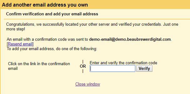 If everything went smoothly you'll see the screen shown below. Now check back in your Webmail account then copy and paste the confirmation code, then click verify.