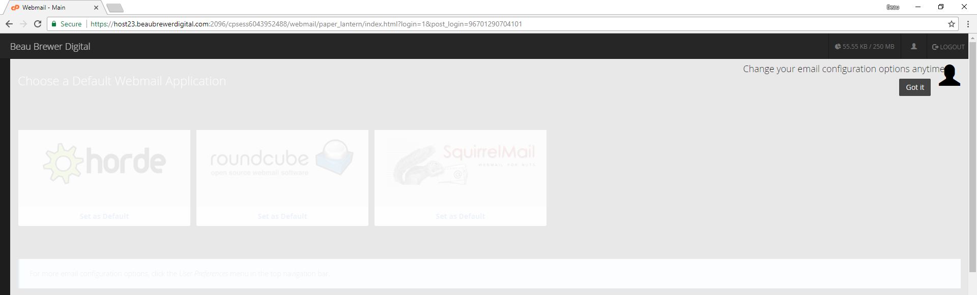 Click 'Got It' to continue. You will them be presented with a screen showing you three choices for accessing your email via your browser.